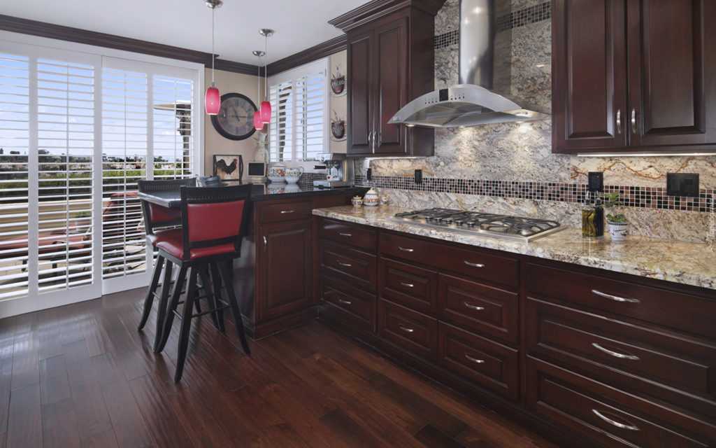 Бордо можно применять почти во всех направлениях дизайнов кухонного интерьера, используя различные текстуры и стилизованные детали.