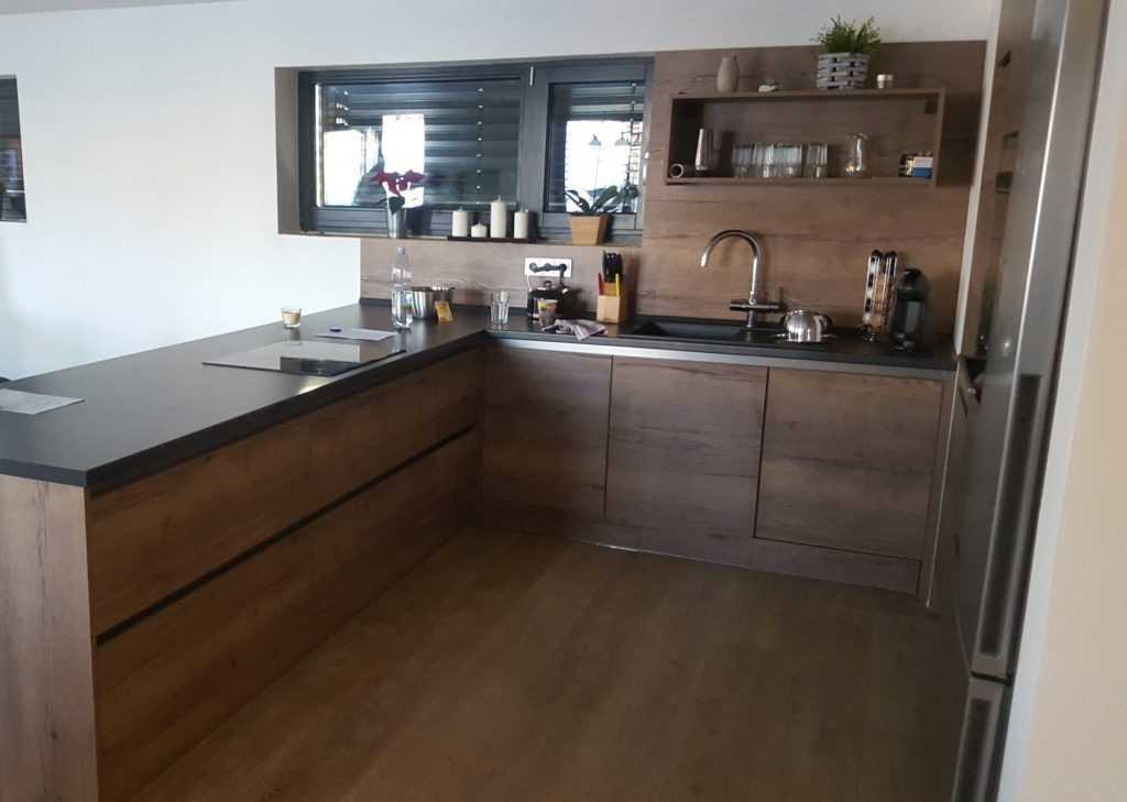 Поверхность может быть выполнена из практически любых современных материалов — компакт-плиты, ЛДСП, шпонированного МДФ, пластика. Фактуры и расцветки, имитирующие ткань — новинка сезона 2022-2023, такие фасады хорошо дополняются матовыми, особенно в решениях в стиле лофт и в современной по стилю кухне.