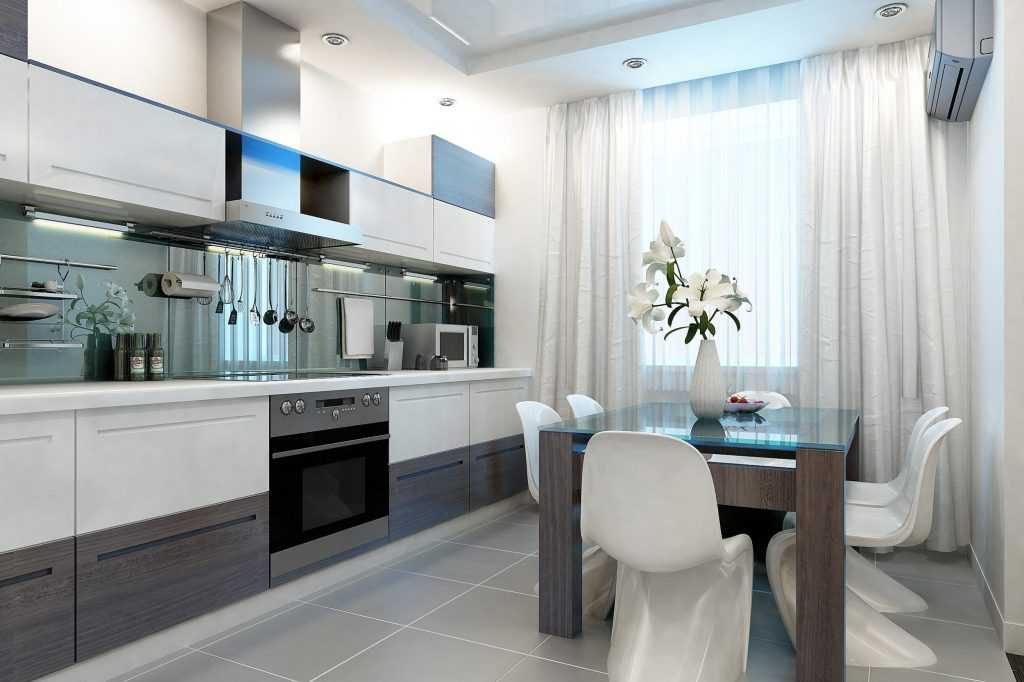 Для него характерны простота и практичность. С помощью светлых оттенков кухня получится не только современной, но и визуально просторнее. Кухонный гарнитур должен быть сдержанным, без вензелей и резных фасадов. Встроенная бытовая техника будет отличным решением. В качестве занавесок для окон стоит использовать жалюзи или римские шторы.