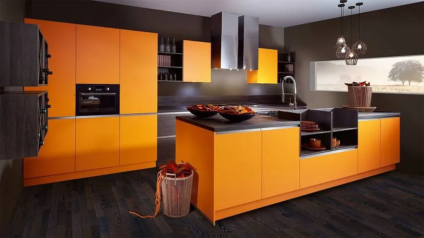 Кухня с коричневыми стенами и оранжевым фасадом мебелиИсточник pinterest.ie