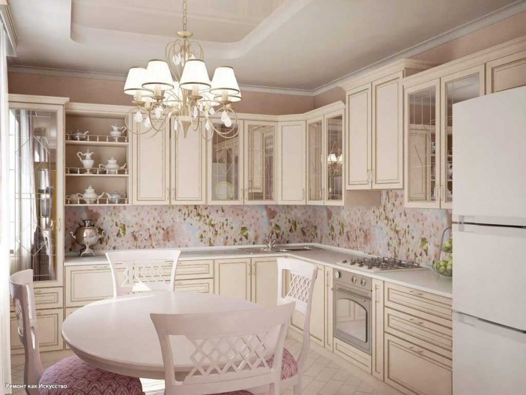 Этот стиль является более изящным. Для него характерно использование натуральных материалов: дерево, керамика, стекло. Кухонный гарнитур может иметь резные фасады и винтажную фурнитуру. Также приветствуется большое количество декоративных элементов: миленькие горшочки с цветами, винтажные люстры, цветастые занавески. Резные стулья для обеденного стола тоже будут очень кстати для такого интерьера.