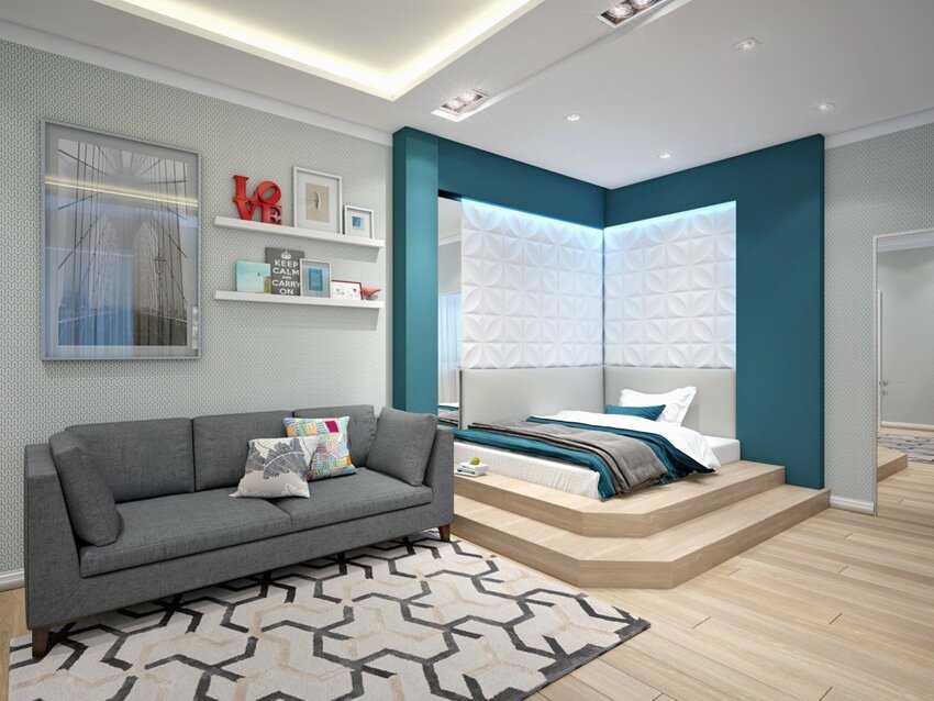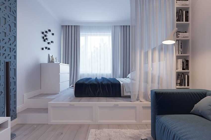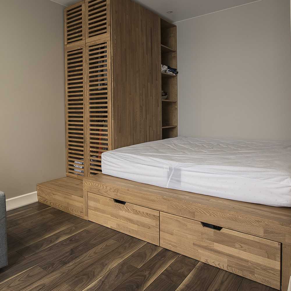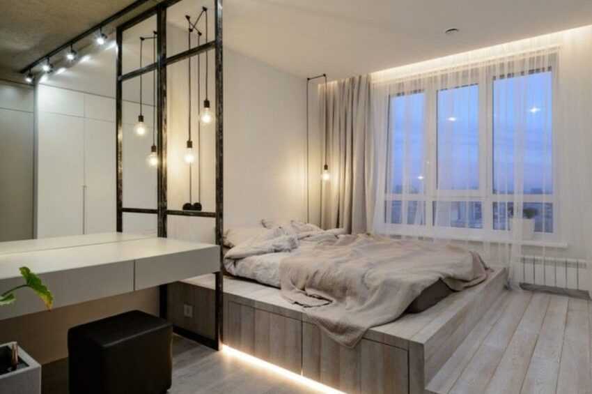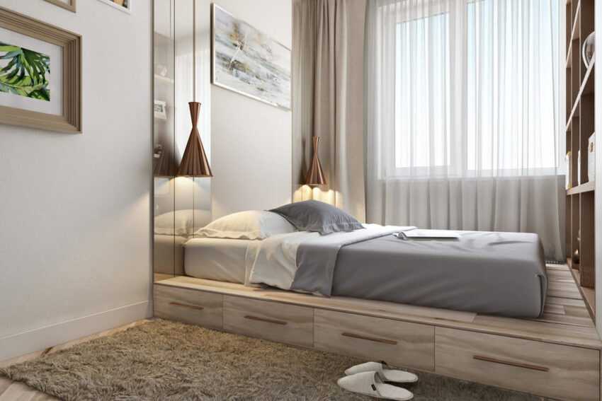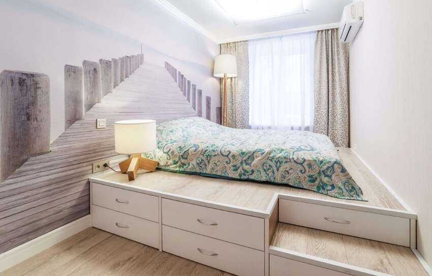 Это еще один интересный вариант, позволяющий экономить пространство. Он актуален для разных комнат: кровать-подиум можно разместить как в небольшой спальне, так и в загородном доме.