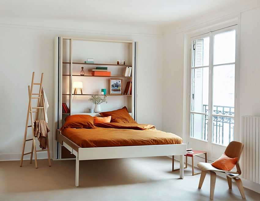 Для небольшой комнаты существуют необычные модели. Например, откидная или складная кровать, такой вариант расправляется на время сна, а когда он больше не нужен – сворачивается к стене и визуально превращается, например, в шкаф или диван. Раскладная модель чаще всего выполняется без изголовья, а его функции выполняет задняя стенка шкафа, в который кровать и убирается. Для семьи с ребенком, живущей в малогабаритной квартире, есть отличный вариант: двухэтажная двухместная кровать. Обычно, один этаж как раз представляет собой двуспальное место, а второй – это полноценная односпальная кровать, поэтому места хватит и родителям, и ребенку.