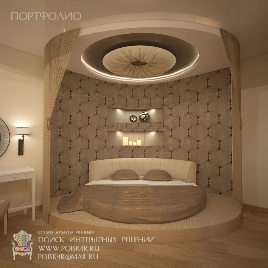 На круглом подиуме. Вариант для просторного помещения. Подиум занимает большую площадь, а его высота редко превышает 20-30 см. Конструкция может быть усложнена выдвижными ящиками, нишами, изголовьем, ночными столиками. Матрас имеет стандартную прямоугольную форму, что снимает проблему постельного белья.