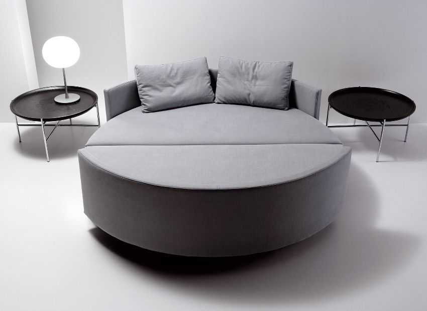 Трансформирующаяся кровать – это бесценная находка для малогабаритных квартир. Специальные механизмы превращают диван в полноценную двуспальную кровать. Дизайнеры поработали и создали круглую кровать-диван трансформер.