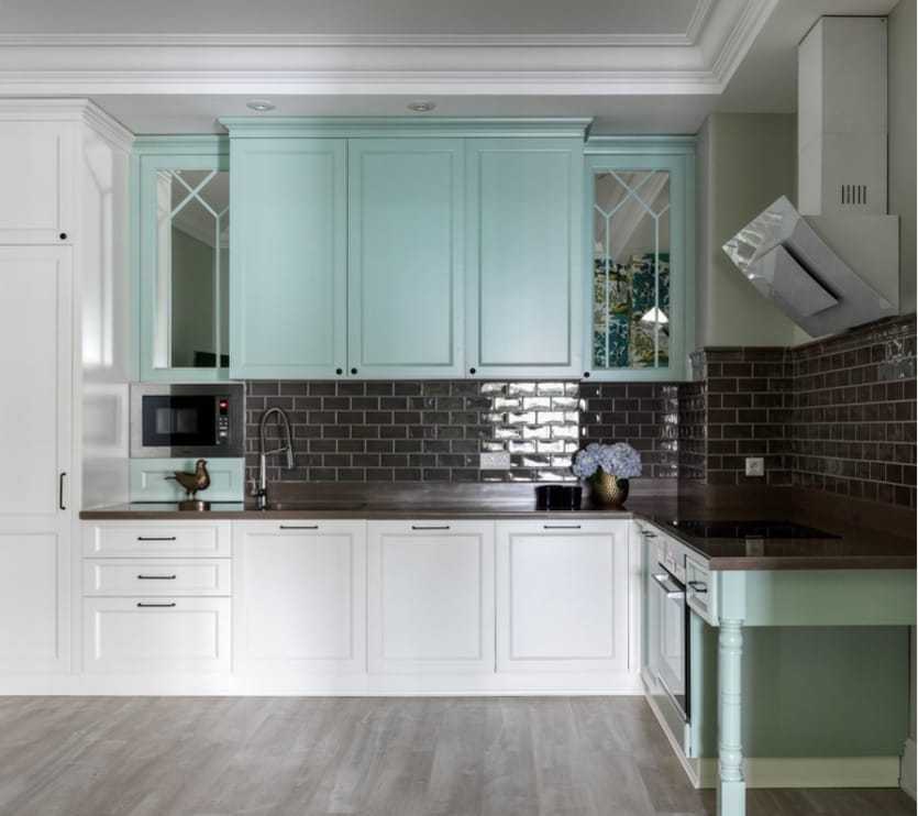 Но мои фавориты, это синий с добавлением серого и зелёного и уходом в оттенки грязно-мятного и грязно-бирюзового. При своей непопулярности и неочевидности, это дизайнерское решение для кухни вполне безопасно в плане шансов на ошибку.