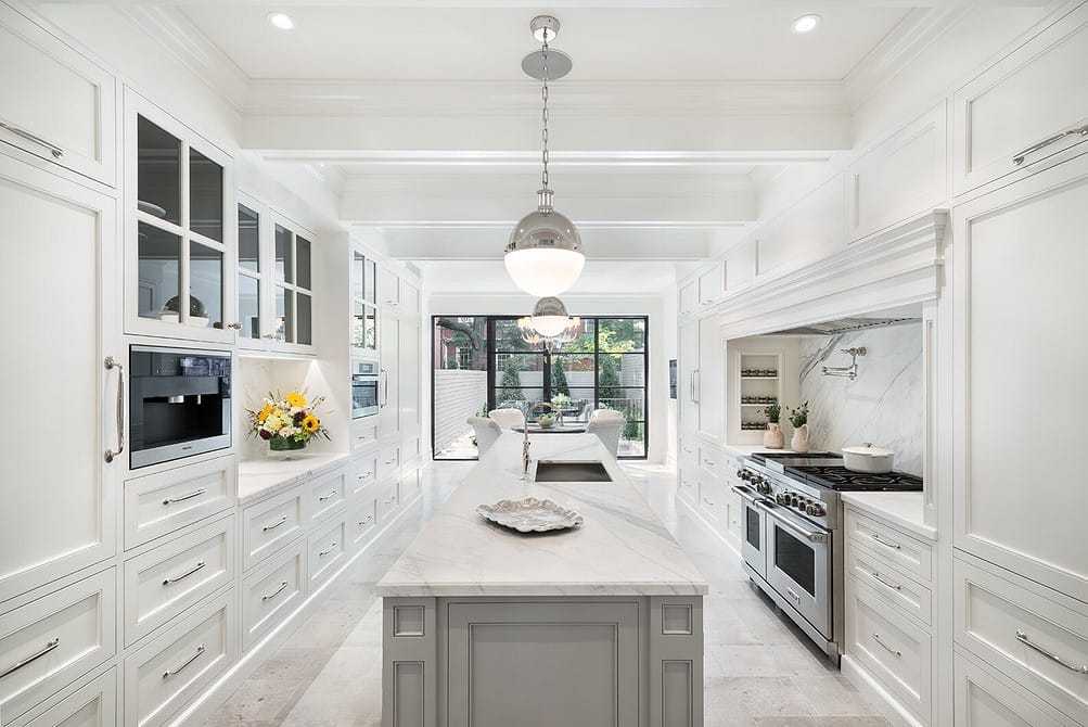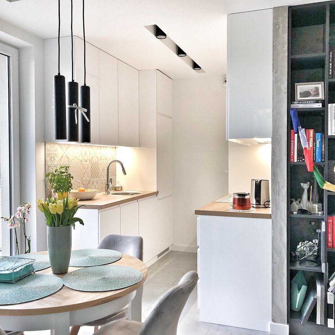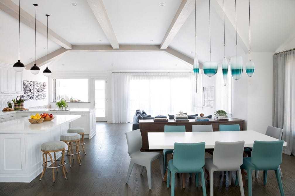Современная белая кухня задействует не более трёх основных цветов: при большом обилии красок дизайн получится перегруженным. Наиболее распространены два варианта: белый + сочный контрастный цвет и белый + один спокойный цвет + немного яркого акцента.