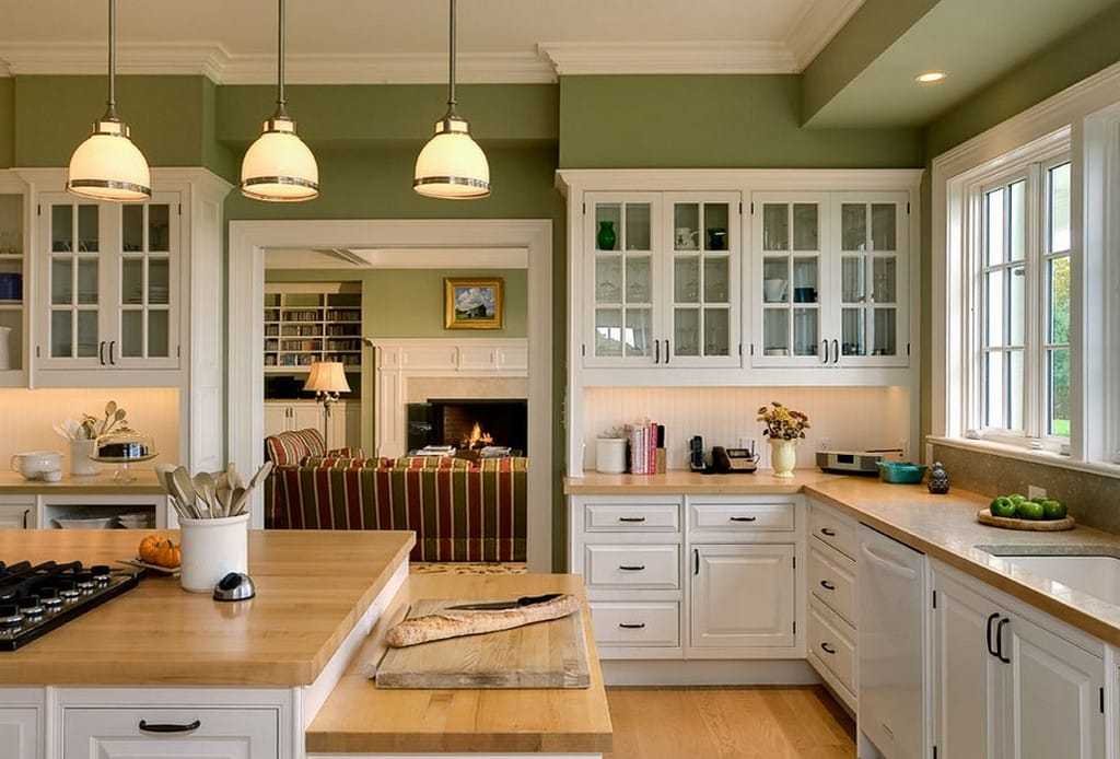 А вот очень рискованное решение — зелёная кухня. Этот цвет очень по-разному выглядит под солнцем и без него, поэтому я бы не советовал использовать в комнате куда попадает много естественного света — результат будет непредсказуем.