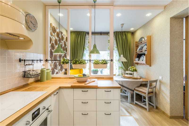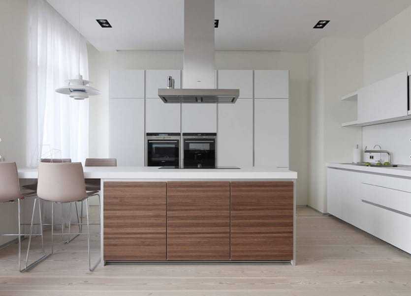 Дерево можно использовать в дизайне столешницы, пола, и даже стен (например, отделать одну их стен деревянными рейками или соорудить из них перегородку в кухне-гостиной).