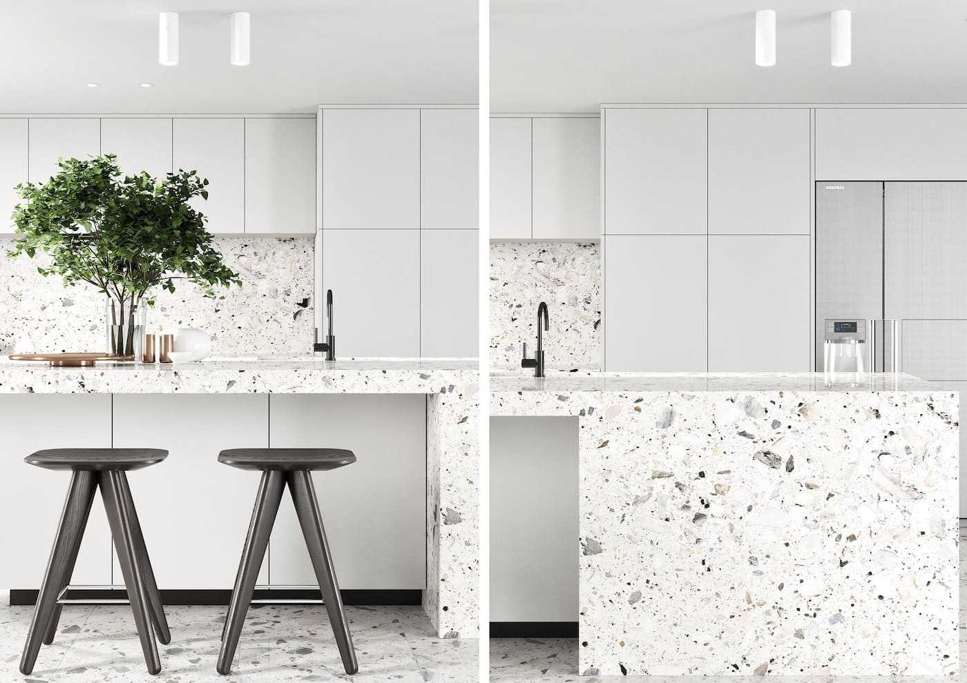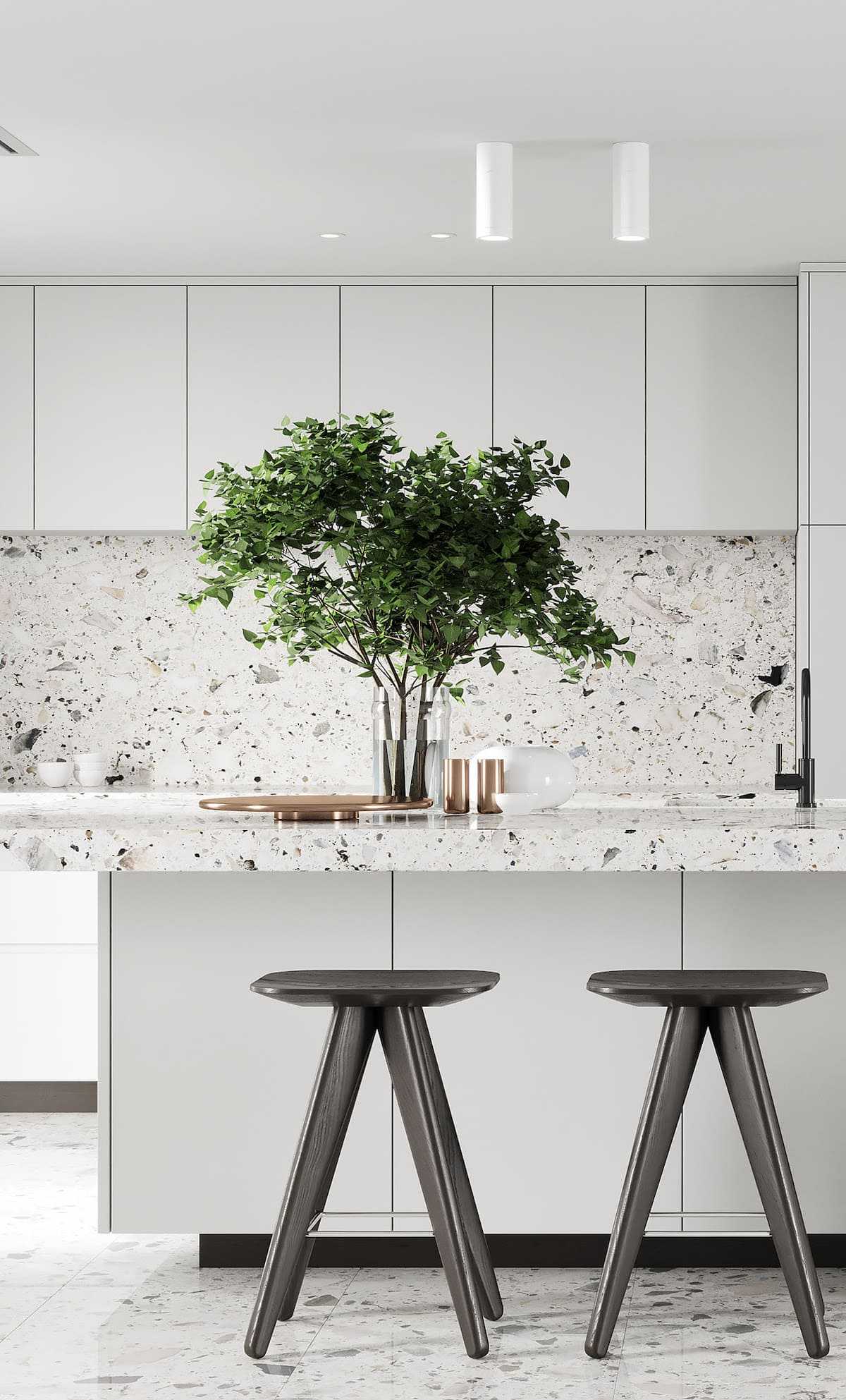 Во многом кухни на картинках выглядят красиво и дорого благодаря люксовым материалам: камень, каменный шпон, паркет на полу, массив на фасадах, натуральное дерево на столах и барных стойках.