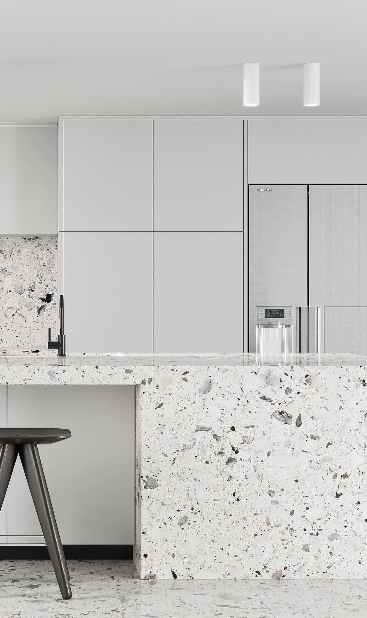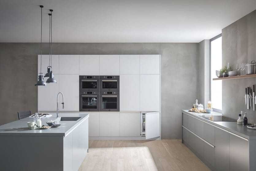 Многогранные оттенки серого – находка для ценителей холодного функционального минимализма и хай-тека. Благодаря белому такая кухня не кажется слишком мрачной, выглядит светлее и легче. Это хороший выбор, если окна выходят на солнечную сторону и в комнате всегда светло и жарко – иллюзия прохлады и легкости обеспечена.