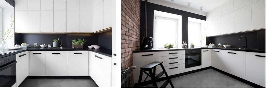 Черный и вообще тёмный глянец фасадов я не рекомендую — жутко непрактичный вариант. А вот в матовом неоднородном исполнении вполне может получится интересная кухня.