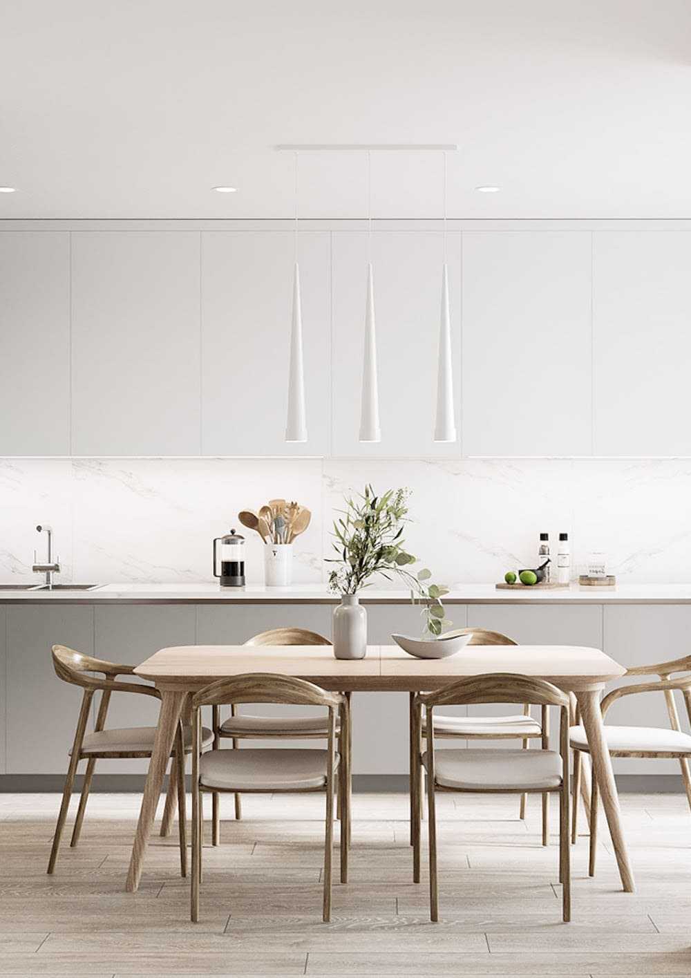 Натуральные деревянные поверхности не дадут кухне стать слишком холодно-минималистичной. Это могут быть стол, столешница, напольное покрытие или даже отделка фрагмента стены. Уместным будет повесить деревянную утварь на стены на крючках.