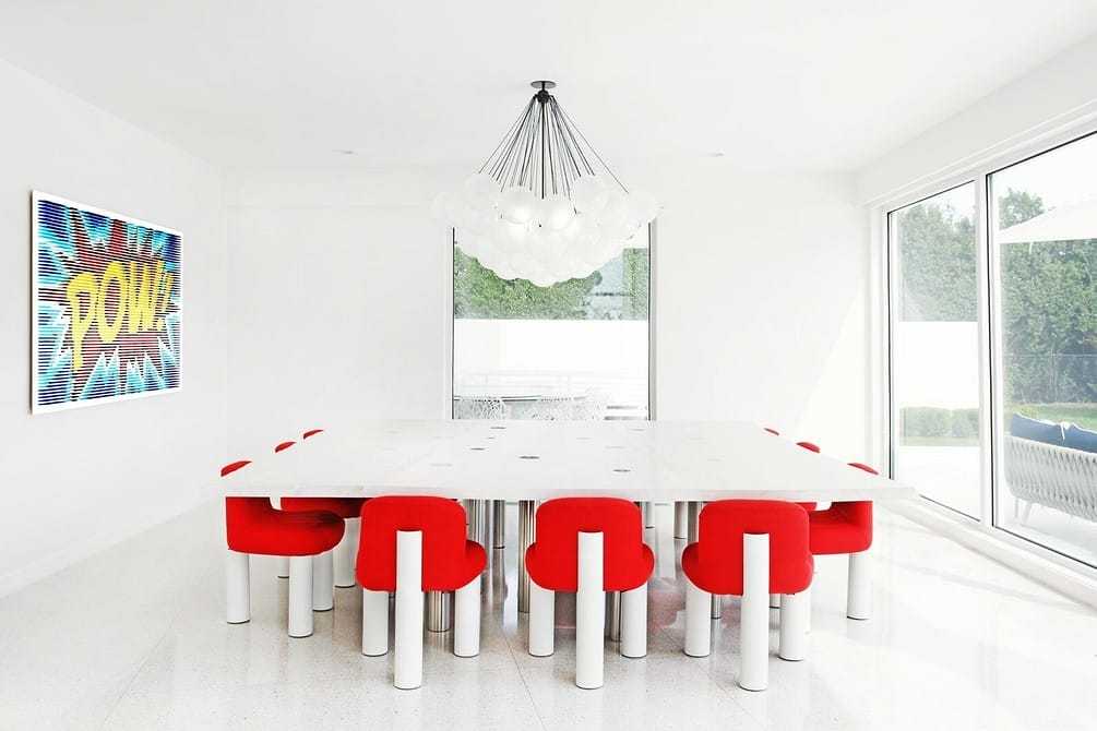 Ключевым украшением потолка для Art Deco считаются люстры. Прекраснее всего, если они будут тяжелые и высокопарные, очень часто с применением хрусталя или деталей из ковки. Также уместны и яркие представители направления модерн. Вы можете применить как одну люстру, так и соединять ее с светодиодными спотами. Ещё одним прекрасным вариантом считается использование сразу нескольких источников освещения над зоной для обеда.