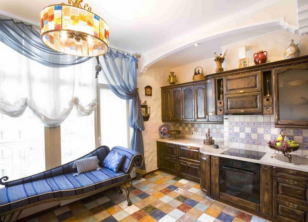 Комнату в арабском и индийском стилях сложно представить без мягкой обивки, подушек, тяжелых штор. В кухне, конечно, нелегко применить все эти материалы, но если совместить ее с гостиной, то получится шикарно. Текстиль украшается узорами, орнаментом, вышивкой. Традиционные материалы: шелк, парча, бархат.