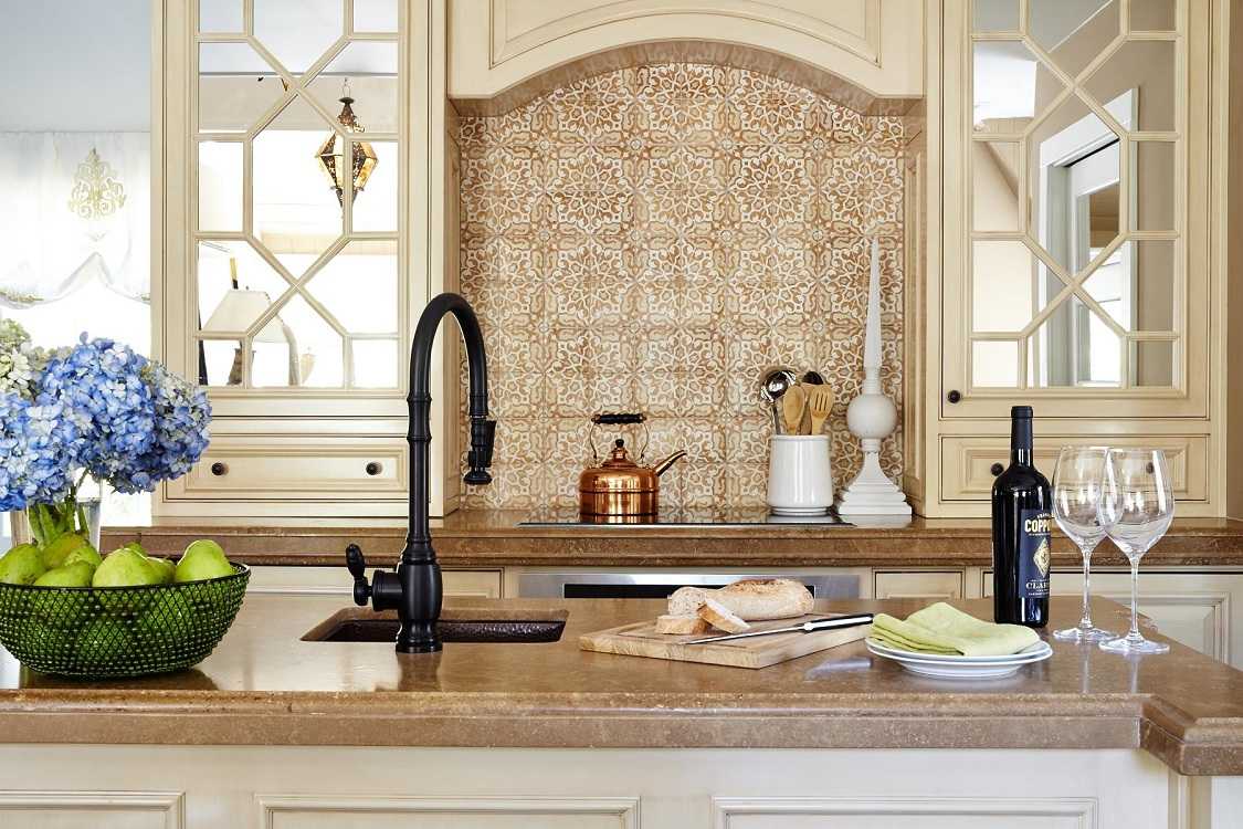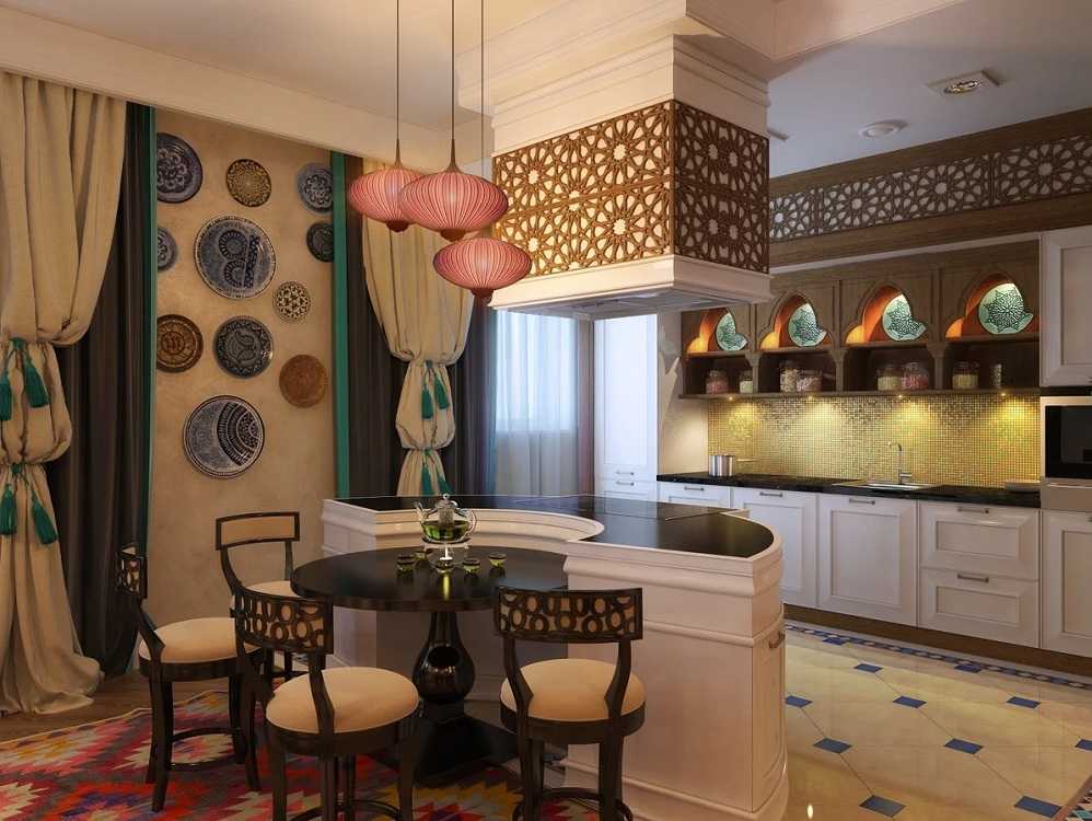 Религия влияет на поступки человека и на то, чем он окружает себя. Это заметно по арабскому стилю, который является представителем восточного направления. В интерьере кухни нет изображений или статуэток животных и людей. Приветствуется мозаичная графика и орнаменты в виде геометрических фигур. Флористическая тематика приближает к природе, поэтому присутствует на текстиле и поверхностях. Кухня в арабском стиле имеет обозначенный центр, от которого расставляется мебель. В помещении с таким интерьером нет распашных дверей. Проем обрамляется аркой, что увеличивает пространство.