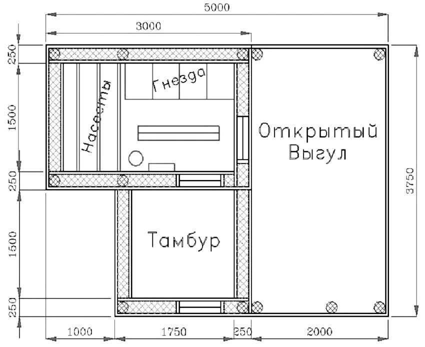 В себя включает обозначение поголовья пернатых и варианта постройки. На основании таких данных делаются расчёты длины, ширины, высоты будущей конструкции. Так, самая маленькая площадь помещения закрытого типа для 20 особей должна составлять не менее 5–6 кв.м, выгула – не менее 10 кв.м.