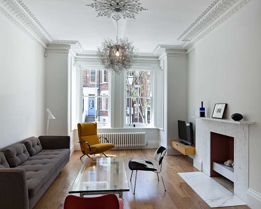 Во-первых, молдинги и узоры по верхним и нижним углам сделают пространство выразительнее. Такой прием часто используется в современных минималистичных и неоклассических интерьерах, где декора почти нет, цветовая гамма преимущественно монохромная, а дизайн выглядит интересным и объемным за счет линий и фактур.