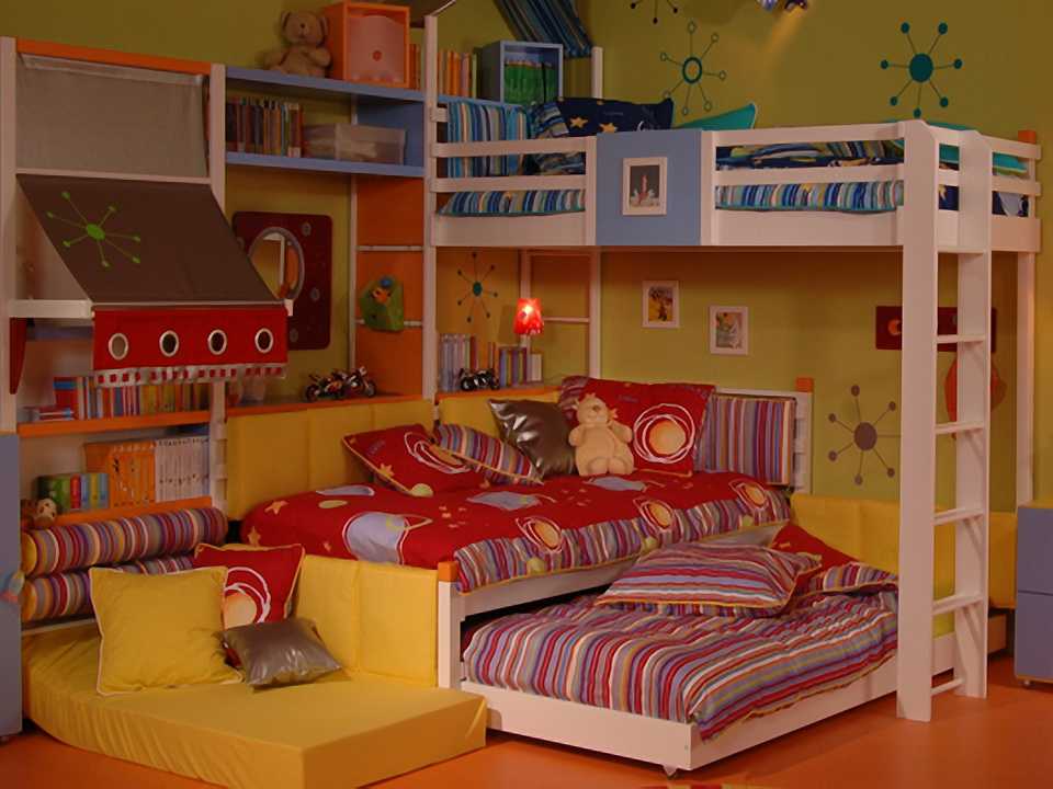 В детской, рассчитанной на нескольких детей, не обойтись без двухъярусной кровати классического типа. Если ребенок боится высоты, можно приобрести обычную откидную или выкатную двухъярусную кровать.