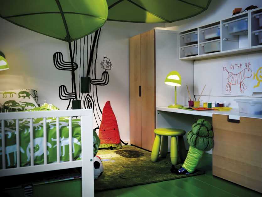 Комнату для ребенка дошкольного возраста не стоит перегружать мебелью. Здесь вполне будет достаточно кроватки, маленького столика для творческих занятий, небольшого шкафчика и стеллажа под игрушки. Пусть остальное пространство останется для развлечений. Покупай безопасную и устойчивую мебель. Высокие предметы дополнительно зафиксируй к стене, а также избегай острых углов.