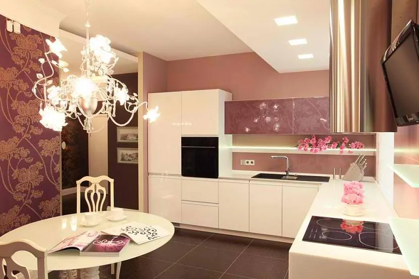 Прованс, представляет пастельная палитра в отделке стен, пола и потолка, использование цветочных узоров и установка винтажной мебели. Подобный нежный и легкий дизайн прекрасно вписывается в кухню со скромным метражом.