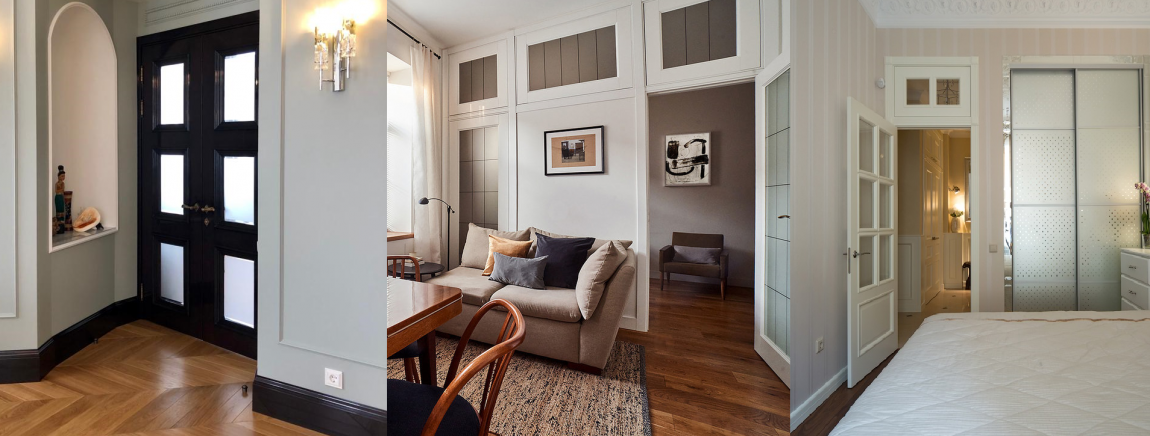 Классические межкомнатные двери хороши в исторических стилях: барокко, ар-нуво, ар-деко. И в географических: прованс, парижский шик, скандинавский и английский стили. По сути это нейтральный вариант, который, в сочетании с такой же нейтральной отделкой, может стать базой для стилизованных пространств и экспериментального смешения стилей. Не впишется дверная классика разве что в пространства с индустриальным колоритом в стиле хай-тек и лофт.
