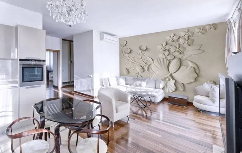 Зонирование. Такой вариант будет полезен для маленьких квартир или помещений. Фотообои помогут обозначить начало и конец той или иной зоны. Например, часто именно так разделяют кухню, столовую и гостиную. Можно повесить различные обои в три части стены, указав тем самым на отдельные зоны.