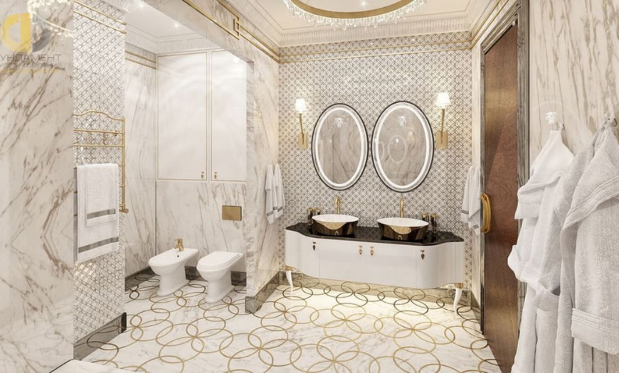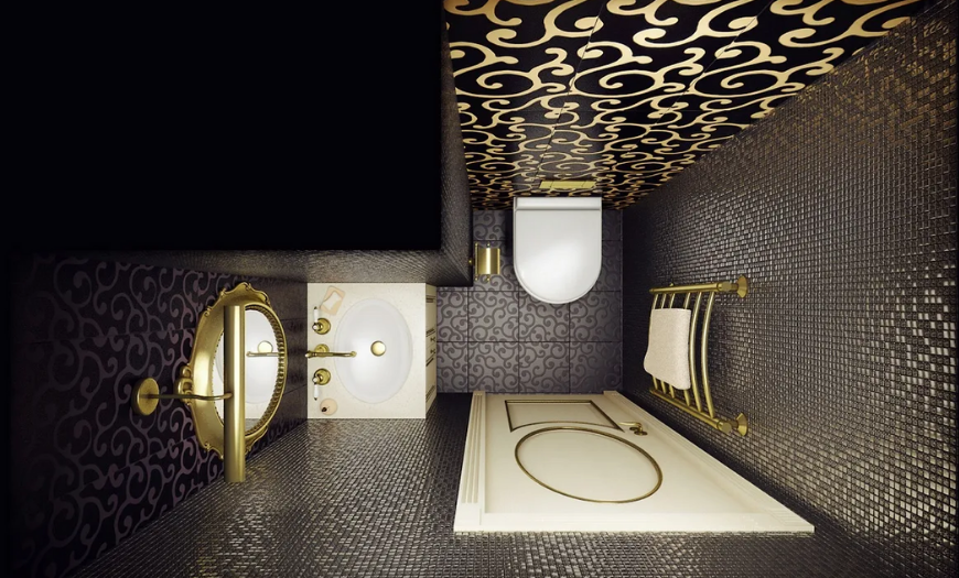 Ванная в стиле ар-деко объединяет в себе элегантность, гламур и роскошь. Доминирующими цветами выступают контрастные черный и белый, однако могут присутствовать и другие оттенки: