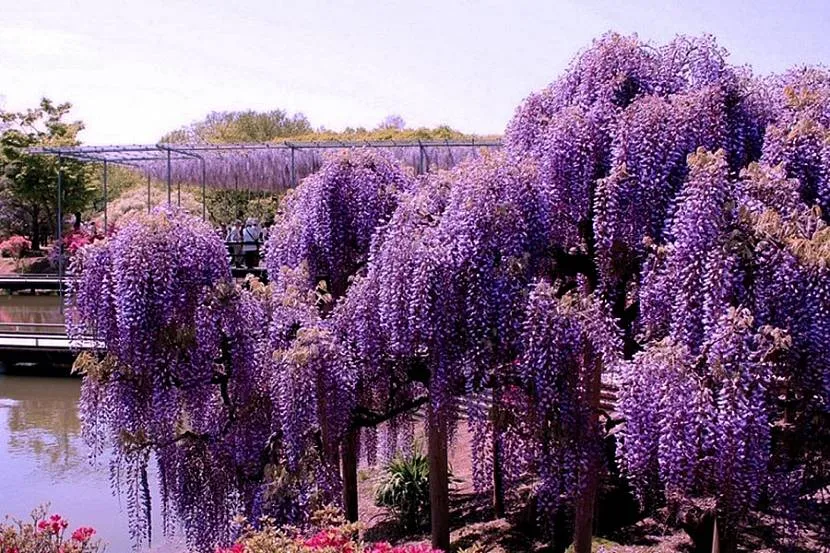 Вистерия китайская. Эффектное и привлекательное растение с густой кроной и крупными цветами лилового оттенка. Соцветия свисают вниз, как гроздья винограда. Отличается продолжительным периодом цветения, а также очень приятным ароматом. Для хорошего самочувствия требует большое количество солнца.