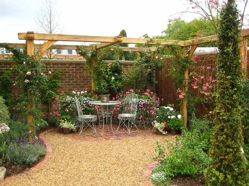 Желающие ощутить эффект полного погружения перголы в общую стилистику сада высаживают по периметру стен строения вьющиеся растения. Через несколько сезонов стебли разрастаются настолько, что беседка с перголой органично поглощается природой. Создается впечатление естественного происхождения конструкции.