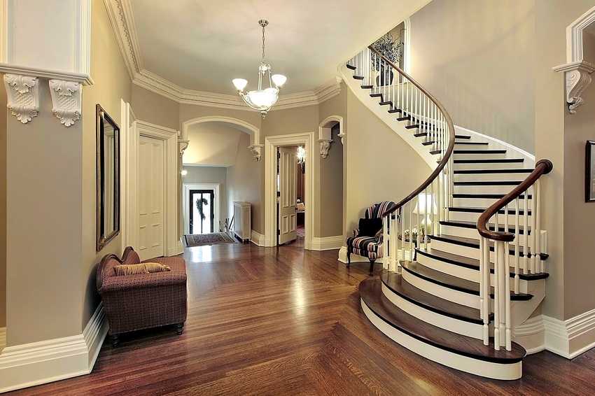 Для убранства внутри дома в стиле классик отменным решением будет лестница с перилами из ковки, увенчанными поручнями из натурального дерева. Также прекрасно выглядят тяжелые конструкции из дерева с элементами декора, подчеркивающими богатство убранства.