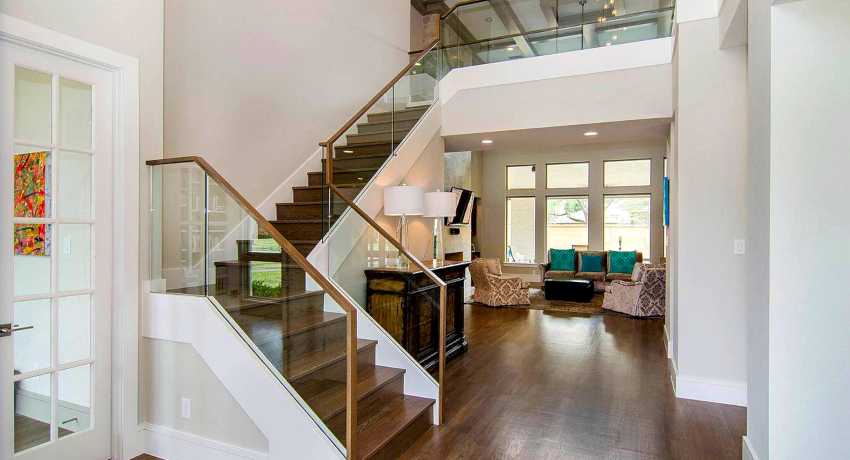 Стеклянные конструкции выглядят эффектно. Их дизайн отлично подходит для интерьера, выполненного в стиле хай-тек. Вряд ли стеклянные перила подойдут для оформления крыльца.