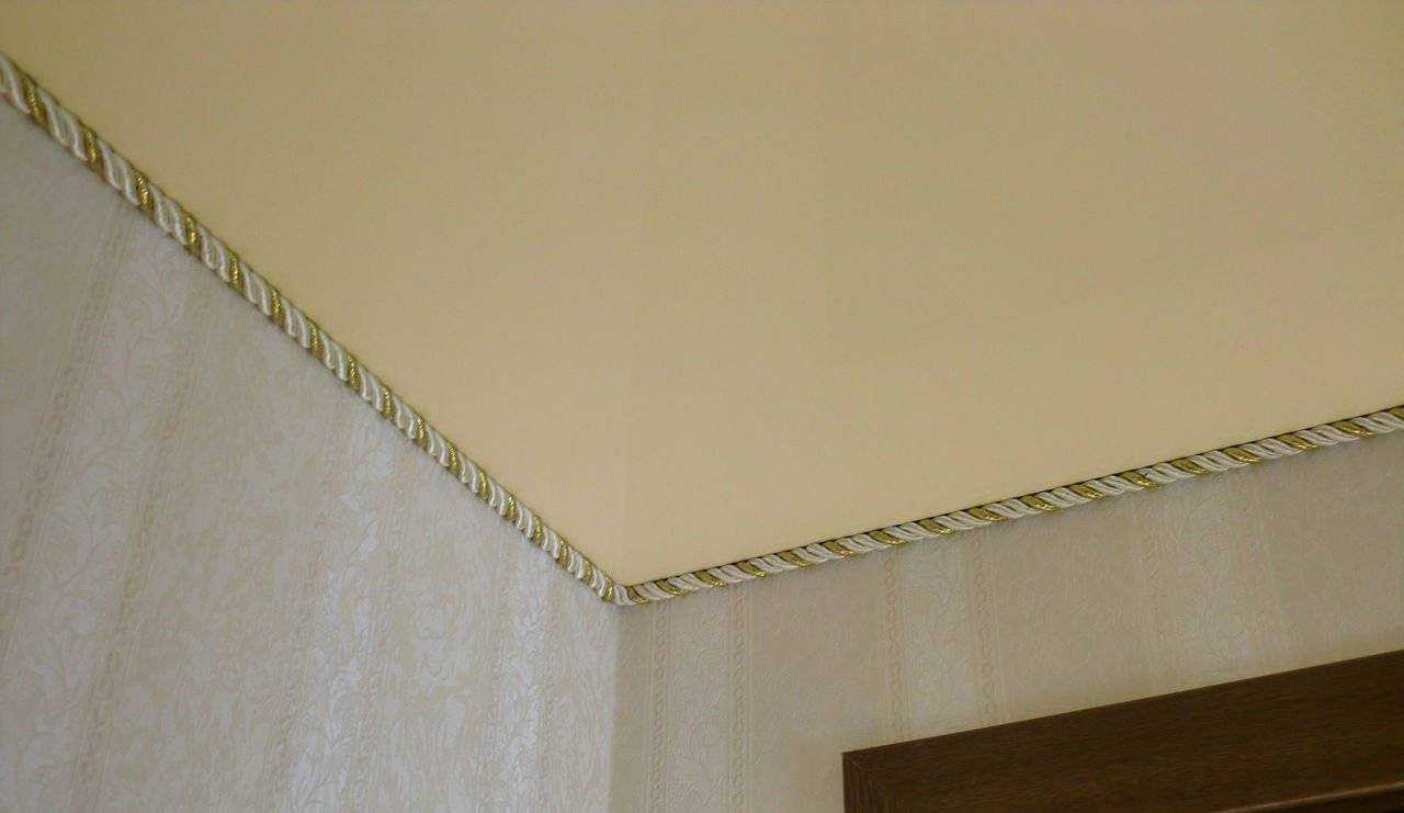 Еще один способ заделать щель – закрыть ее декоративным шнуром, сплетенным из нитей – однотонных, соседних или контрастных. Часто вплетают металлизированные нити – золотые, серебряные. Такой шнур отлично смотрится в сочетании с матовыми, замшевыми или сатиновыми полотнами. Это отличный способ декорирования для таких комнат, как гостиная, спальня, прихожая, столовая или кабинет.