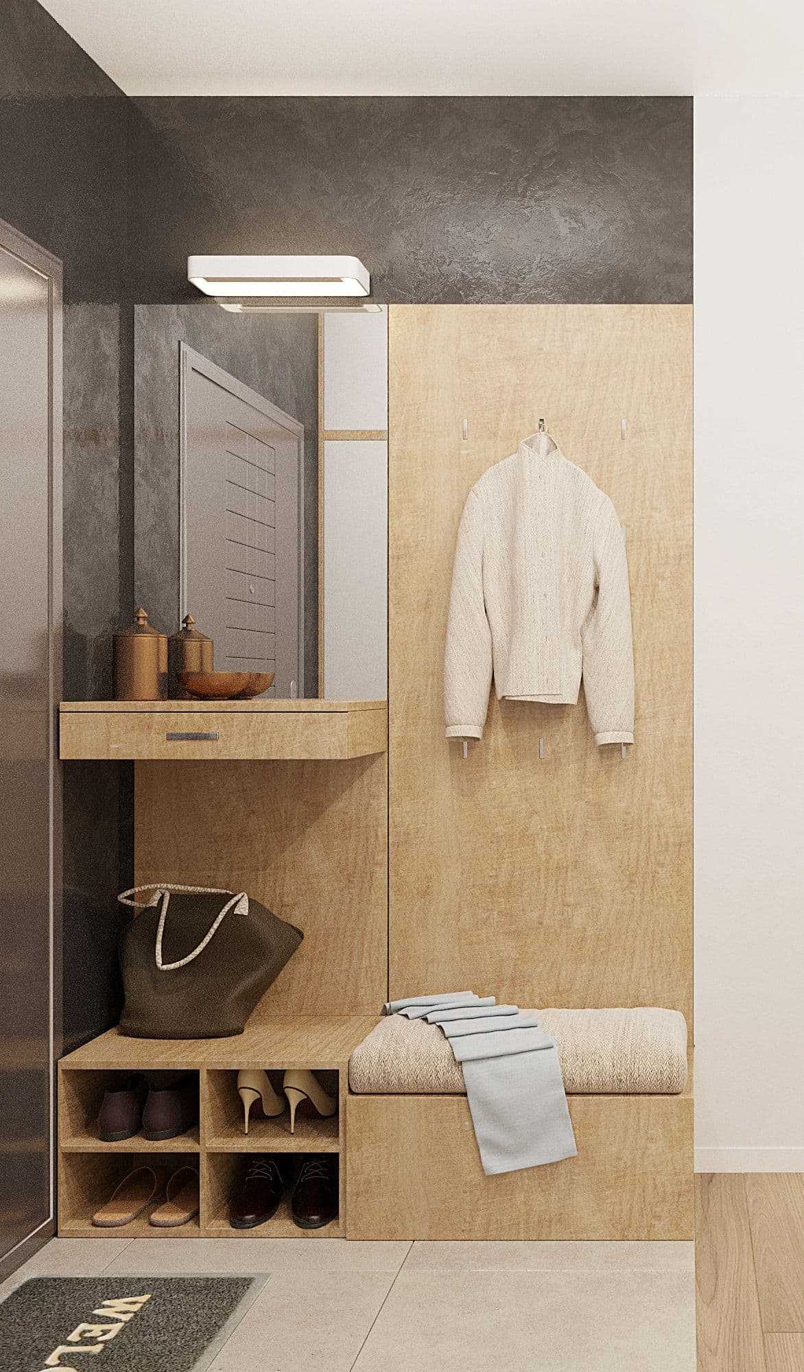 Активно используются разного рода ниши, позволяющие организовать метры не с двухмерной точки зрения, а с трехмерной. Например, удобная скамья в нише, на которой расположены крючки для того, чтобы быстро разместить одежду с улицы. Под скамьей – еще одна ниша, для обуви, которая благодаря теплой подсветке превращается еще и в элемент декора.