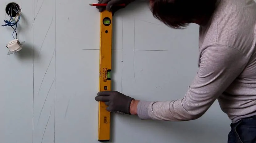 - Используя строительный уровень, нанесите разметку на стену так, чтобы вы четко видели схему расположения фрагментов полотна. Вы можете отметить все ряды или же сделать это только для первого модуля. В остальном все будете приклеивать встык.