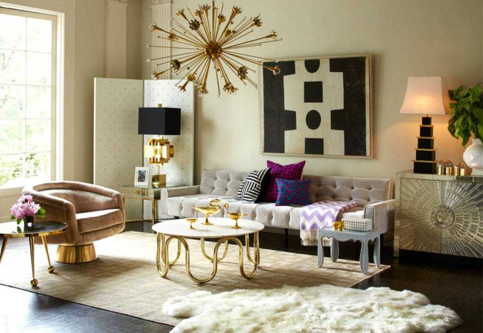 Для помещения гостиной необходим наиболее скрупулезный подход. Это помещение требует полного соответствия предметов обстановки дизайну интерьера, его цветовому решению, стилю. Как правило, она служит для визуального отделения зоны приготовления пищи в квартирах-студиях, территории для сна (в однокомнатных квартирах), кабинета или лоджии.