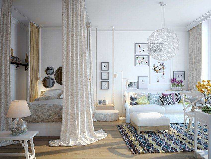 Место для сна и отдыха в однокомнатной квартире отделено при помощи текстильной перегородки
