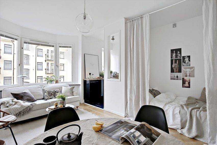 Перегородки в виде занавесей — популярный элемент интерьера, оформленного в скандинавском стиле