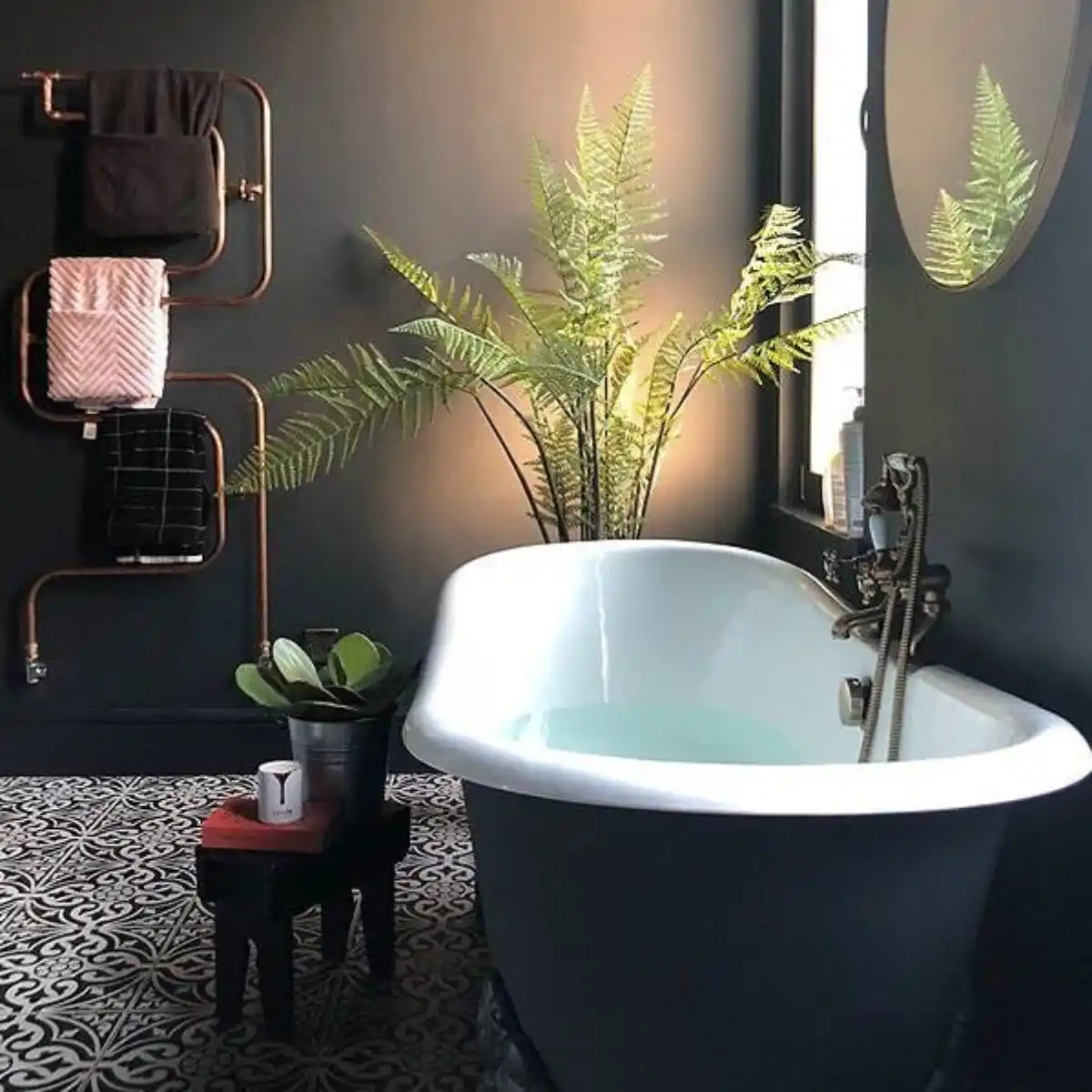 Создайте образ бутик-отеля в своей ванной комнате с темными, чернильно-голубыми или почти черными стенами и потолками. Сделайте этот мрачный, но элегантный декор ванной комнаты с позолоченными зеркалами и роскошными текстурами. В том числе с пушистыми полотенцами, богатыми медными вешалками для полотенец и ковриками для ванной с высоким ворсом. Темные стены создадут уединенную, интенсивную атмосферу. Вы можете найти сочетание с белым полом и яркой ванной, чтобы помочь сбалансировать светлый и темный. Цвет очень важен для создания настроения. Этот баланс темного, светлого и роскошной отделки даст вам почувствовать себя восхитительно.