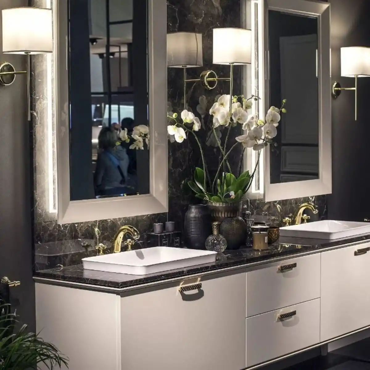Стены могут быть покрыты мозаичными орнаментами, керамическими рельефами, панелями из экзотических пород дерева. Также используются декоративные предметы, такие как мыльницы и шкатулки из золота, темного дерева или стекла и хрусталя. Элегантные светильники, такие как люстра яркой формы или лампа с декоративным абажуром, дополняют декор.