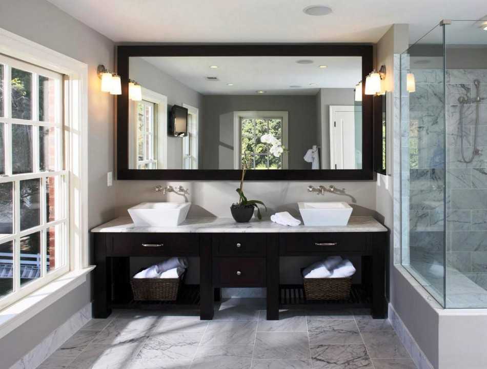 - Визуально расширяют пространство зеркала и стекло: зеркальные детали декора и шкафчики подчеркнут современную стилистику санузла.