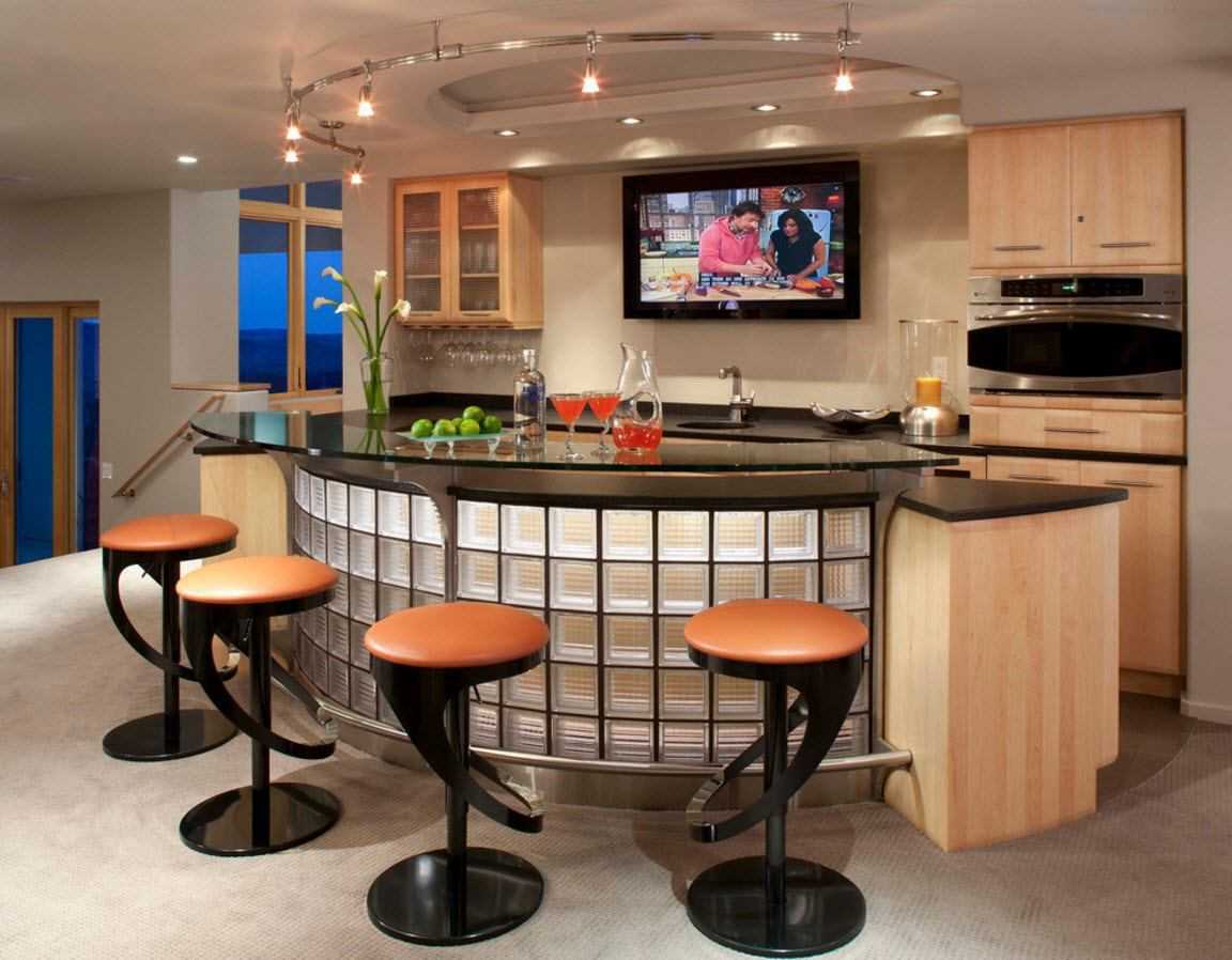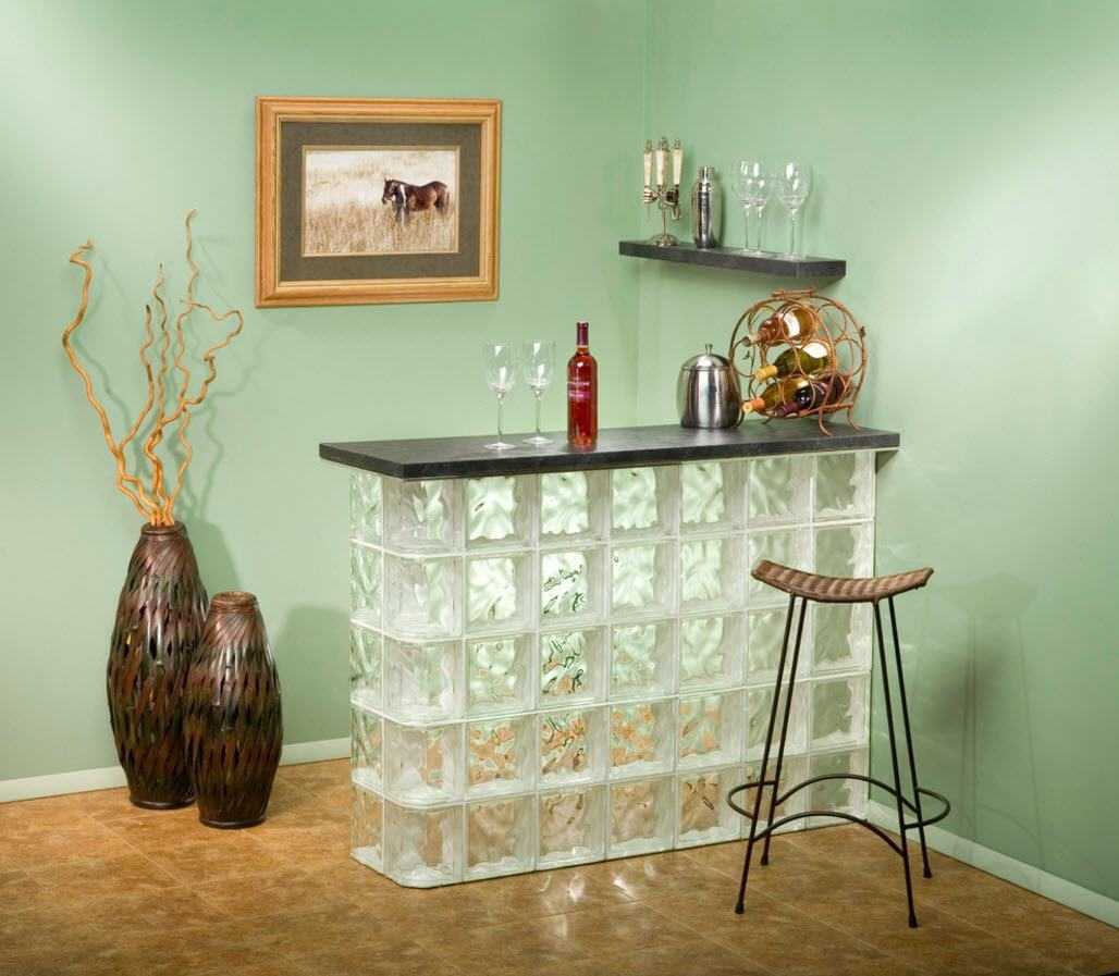 Полукруглая барная стойка из полупрозрачных стеклоблоков? Легкий! Особенно эффектно конструкция будет смотреться, если добавить в конструкцию цветную или монохромную подсветку.