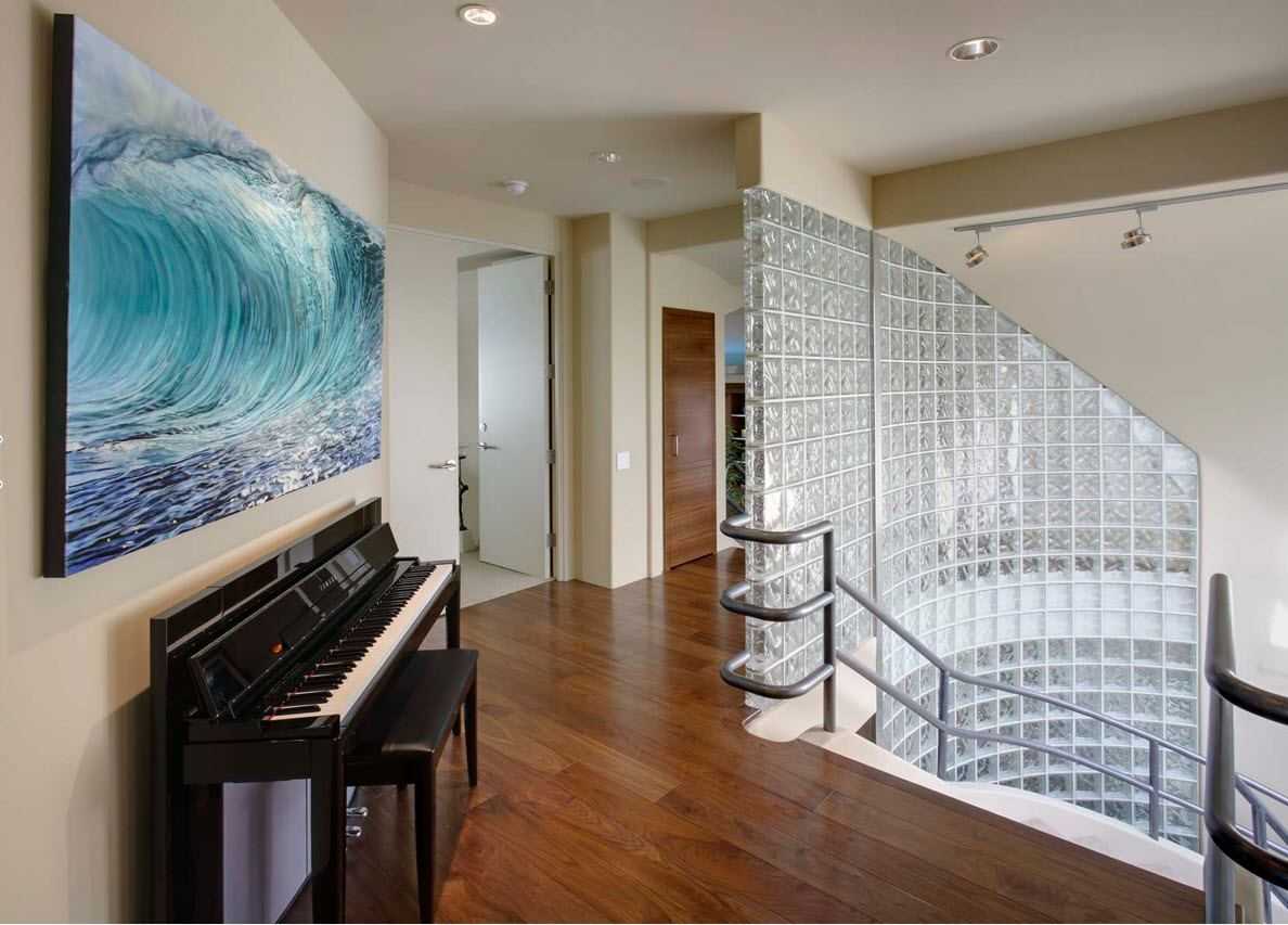 Создание внутренней перегородки из прозрачных стеклоблоков в пространстве лестницы поможет создать легкий, практически невесомый образ этой конструкции. Прочная конструкция защитит вашу лестницу от попадания прямых солнечных лучей из соседних помещений.