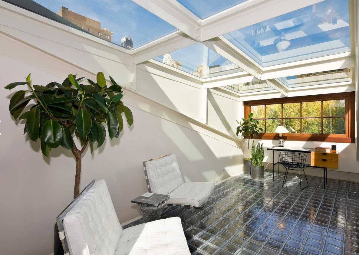 Стеклянными окнами и перегородками уже никого не удивишь. Но использование этого прочного, но полупрозрачного строительного материала в качестве основы для пола может внести оригинальность в любой интерьер. Перед вами лишь один из способов украсить кабинет с зоной отдыха. Стеклянная крыша и пол из стеклоблоков делали комнату воздушной, легкой и легкой.