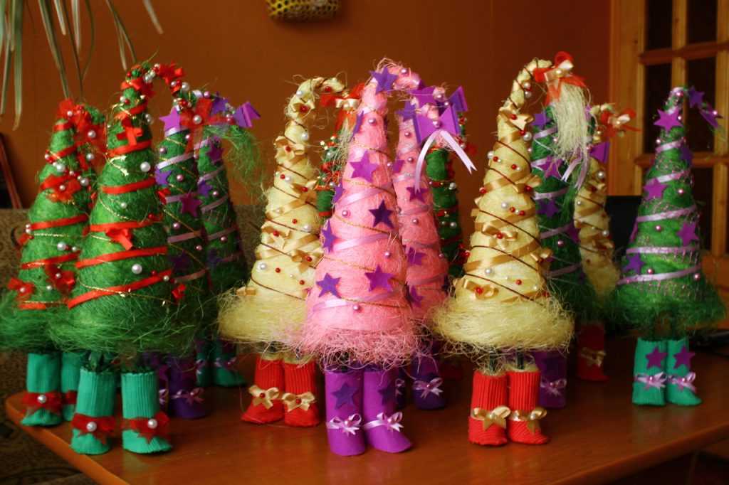 Новогодние сувенирные деревца – особенные топиарии, которые могут быть выполнены из самых разных материалов. Чаще всего делаются топиарии в виде елочки, то есть обычная круглая крона заменяется формой елки.