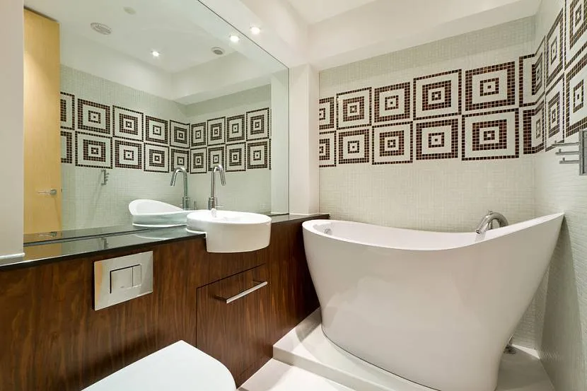 При наличии мозаики на стенах пол выкладывают простой плиткой без узоров, и наоборот. Матовое стекло душевой кабинки должно сочетаться по тону с обоими типами плитки. Лучшим вариантом станет ванна нестандартной формы и соответствующий умывальник. Предпочтительно использовать округлые формы.