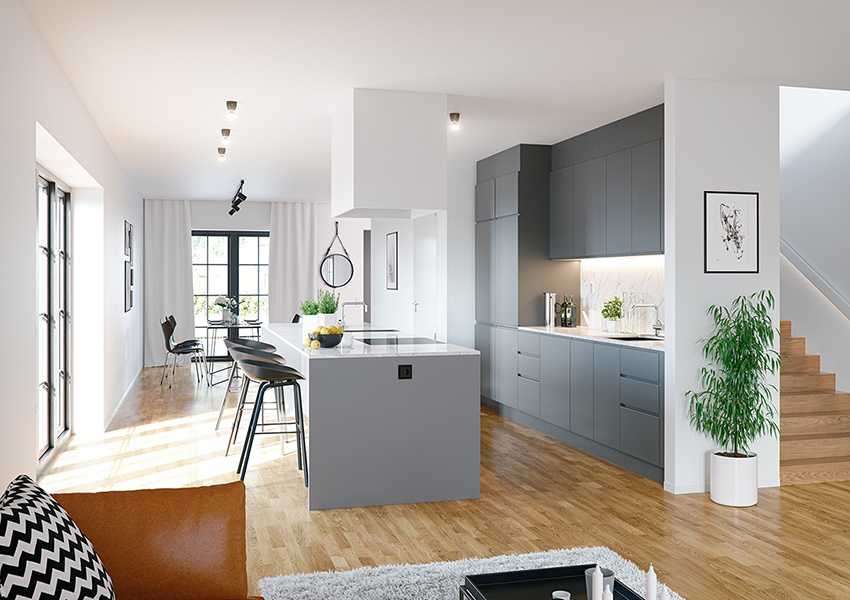 Первый шаг на пути к кухне мечты – разбивка пространства на зоны. Чтобы приступить к дизайну кухни прямоугольной формы, в первую очередь придется определиться с вопросом, для чего вам нужна кухня. Для трапезы в кругу семьи, общения с гостями, готовки, редких приемов пищи. Проанализировать ежедневные хлопоты. Даже если площадь помещения маленькая такой подход поможет значительно оптимизировать пространство. Площадь в этом случае распределяют на 2 зоны: приготовления и обеденную (стол или барную стойку).