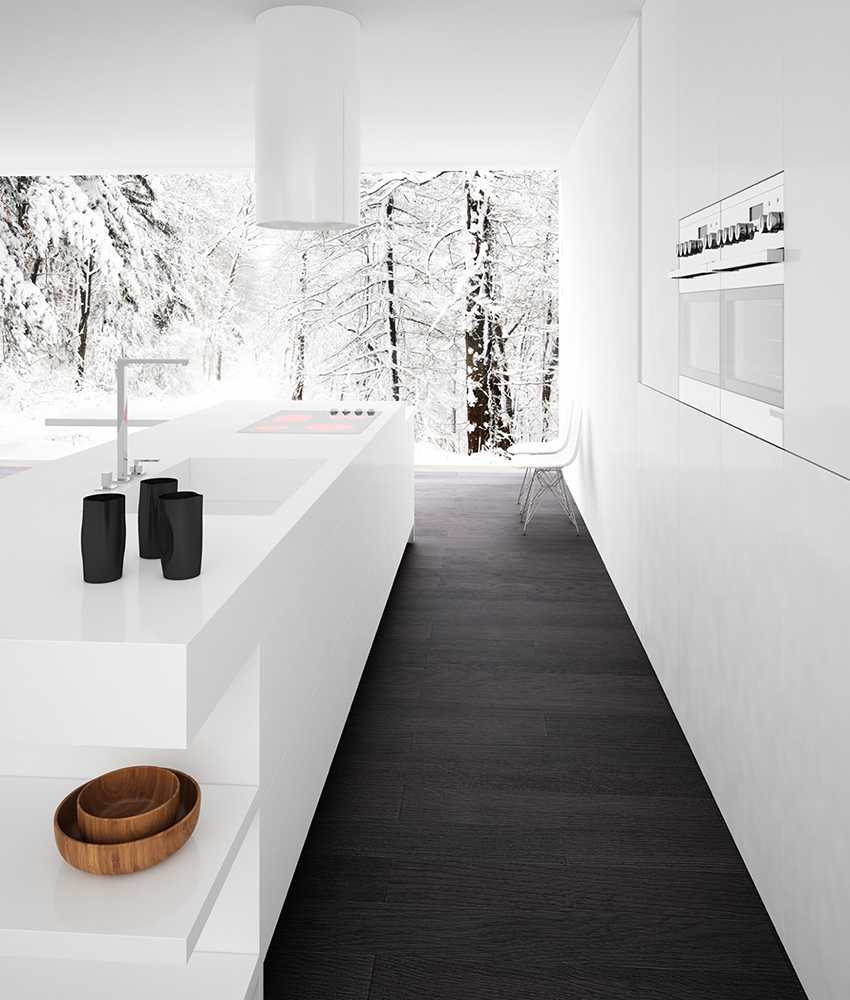 Натуральные деревянные поверхности не дадут кухне стать слишком холодно-минималистичной. Это могут быть стол, столешница, напольное покрытие или даже отделка фрагмента стены. Уместным будет повесить деревянную утварь на стены на крючках.