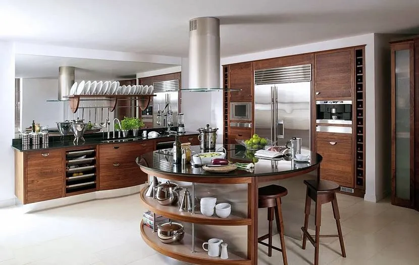 Дерево можно использовать в дизайне столешницы, пола, и даже стен (например, отделать одну их стен деревянными рейками или соорудить из них перегородку в кухне-гостиной).
