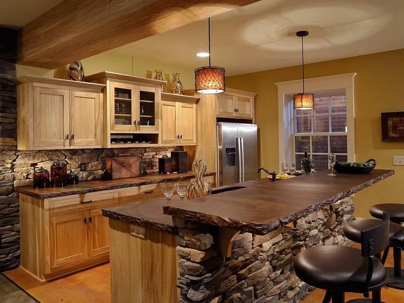 При создании деревенского стиля используются только экологически чистые строительные и отделочные материалы, это является главной отличительной его чертой. Наиболее часто используется дерево, натуральный камень, металл и керамика.